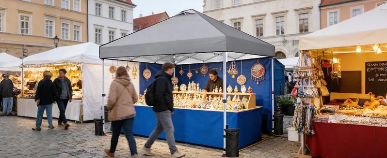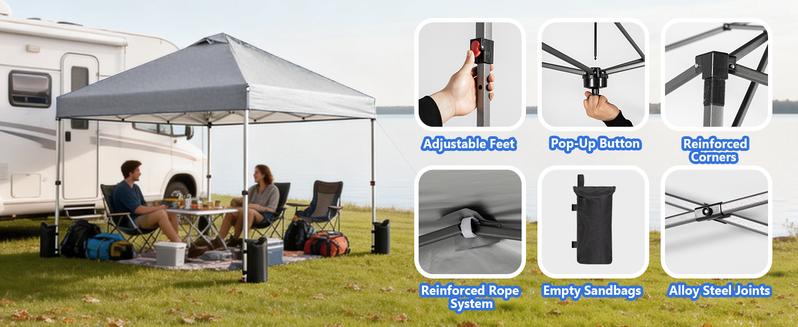 ·Duradera y robusta: Diseñada para mercados y para uso comercial o industrial, esta carpa de 10×10 pies ofrece una durabilidad excepcional. Cuenta con una estructura de tubos de acero de alta resistencia, patas hexagonales con recubrimiento en polvo de acabado martillado, barras de celosía reforzadas, bases de acero con doble orificio de anclaje, deslizadores seguros con botón pulsador y puntos de tensión reforzados en el poste central; todo ello construido para garantizar una estabilidad a largo plazo.