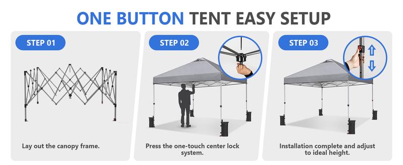 ·Montaje rápido y sencillo: Gracias a su estructura metálica de una sola pieza, el montaje se realiza en solo tres sencillos pasos, sin necesidad de herramientas. Simplemente despliegue la estructura, coloque el toldo y extienda las patas. Los botones de liberación accionables con el pulgar permiten ajustar la altura de forma fluida en tres niveles preestablecidos, con un diseño seguro que ayuda a prevenir el atrapamiento de los dedos.
