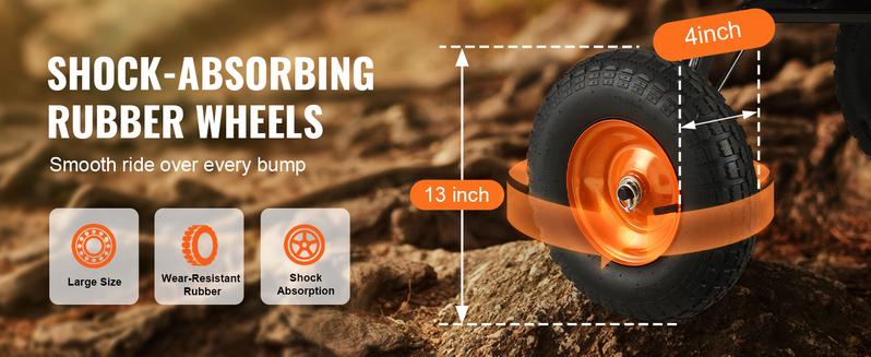 Equipado con grandes ruedas de goma de 13 pulgadas, este carro de descarga para jardín ofrece una excelente durabilidad y absorción de impactos, garantizando un desplazamiento fluido incluso en terrenos irregulares. Las ruedas giratorias de 360° facilitan los giros sin esfuerzo, haciendo que el transporte resulte sumamente sencillo.