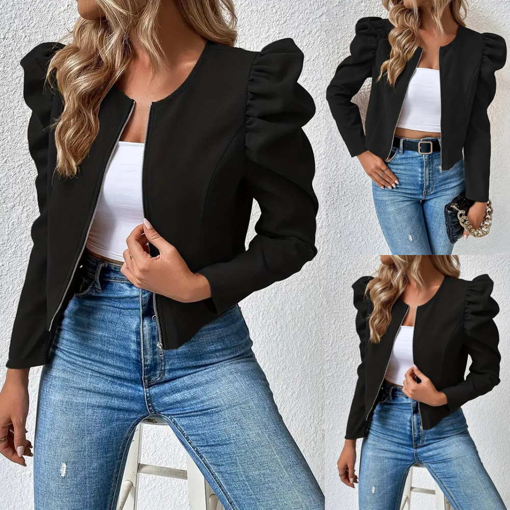 Empieza la nueva temporada con la chaqueta con cremallera Chic, una mezcla perfecta de elegancia y estilo moderno. Esta sencilla chaqueta de color liso desprende un atractivo atemporal y es un complemento versátil para tu armario. Las llamativas mangas gigot con su forma voluminosa y estructurada añaden un toque de dramatismo y sofisticación, elevando tu look a un nuevo nivel. El cierre de cremallera en la parte delantera añade un toque moderno y ofrece funcionalidad y una silueta elegante.