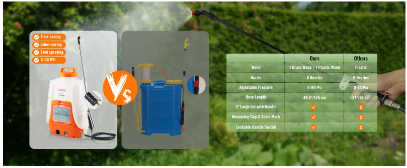 El tanque transparente con marcas de galones facilita ver el nivel de líquido. La tapa de boca ancha agiliza el llenado y el asa bloqueable permite pulverizar de manera continua sin esfuerzo, evitando la fatiga y mejorando la precisión.